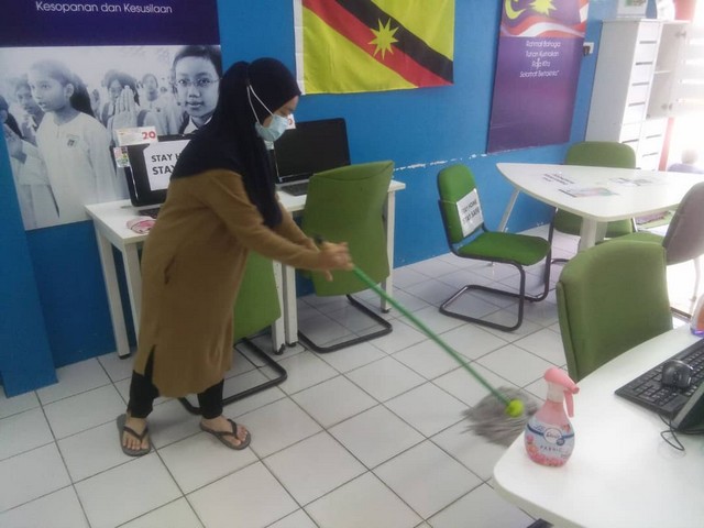 24 Ogos 2020 | Aktiviti TerkiniPada 23 Ogos 2020, petugas PI telah mengambil inisiatif untuk melakukan proses sanitasi di Pusat Internet Sebandi Ulu. Proses sanitasi dilakukan dengan mengikuti garis panduan Kementerian Kesihatan (KKM) merangkumi jenis bahan kimia yang sesuai dan telah diluluskan. Antara cecair yang telah digunakan sebagai bahan untuk menyahkuman bagi tempat tersebut ialah cecair antiseptik dettol.